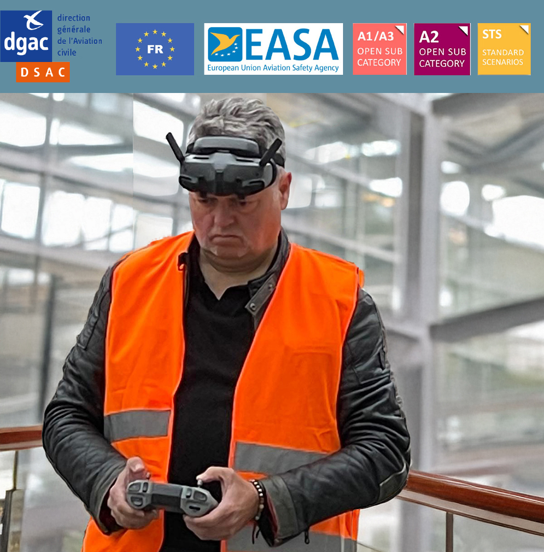 Le télépilote suit le parcours via la vision drone ; l’équipier écrit ce que le télépilote voit.